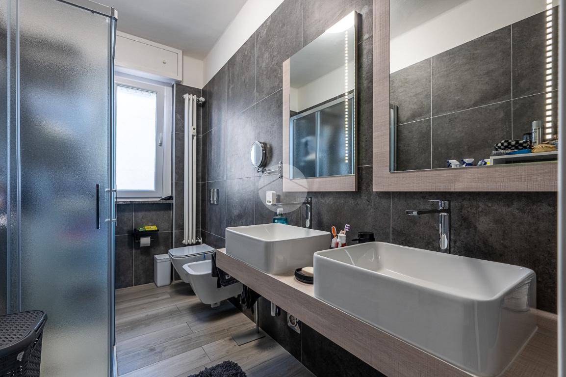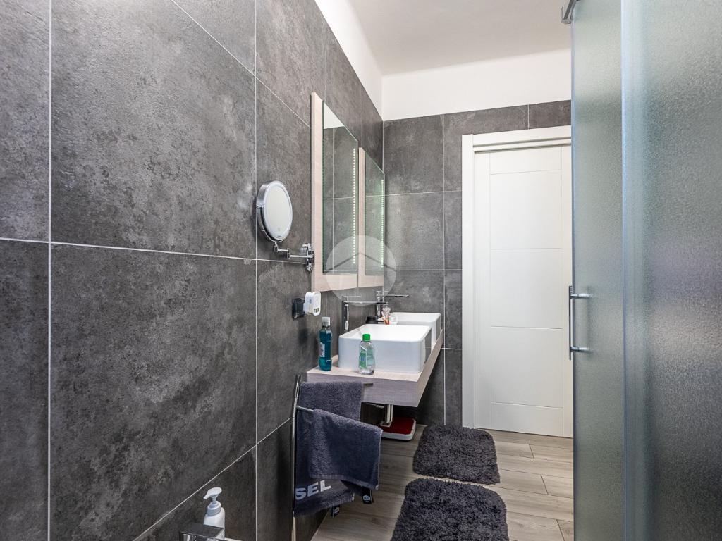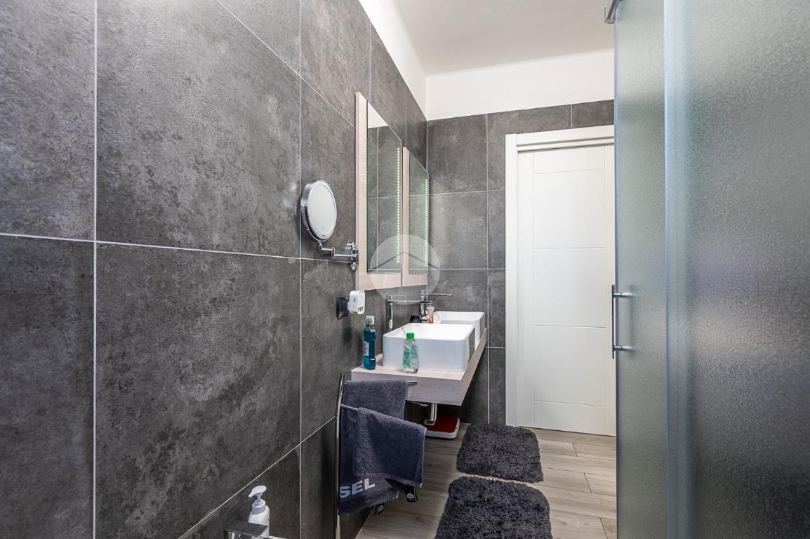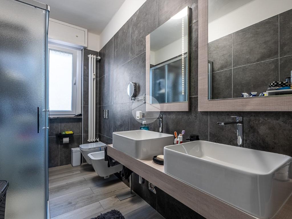 Bagno moderno con ampio box doccia e doppio lavabo, camera da letto luminosa con finestra e cabina armadio.